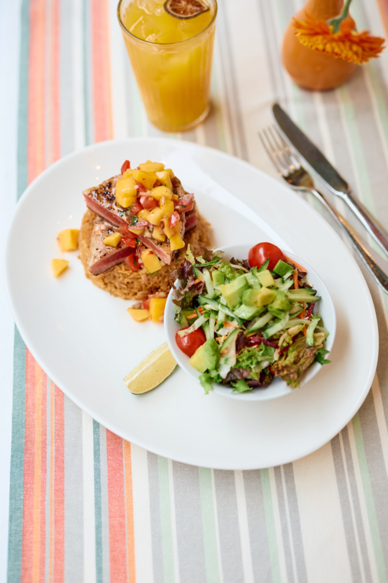 63. Grillezett tonhal steak mangó salsával, salátával és karibi rizzsel Fotó c d i j k l