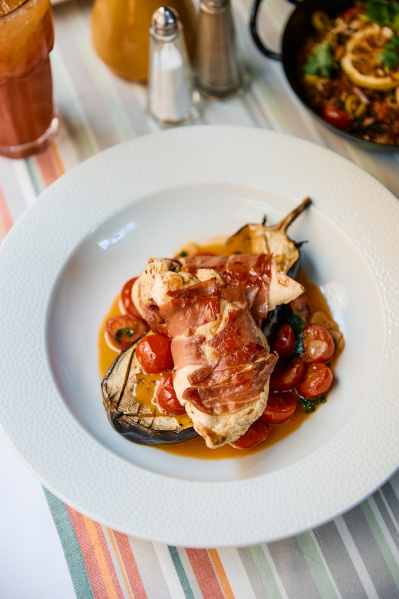 65. Pechuga de pollo Saltimbocca con berenjena asada y tomates cherry al vino blanco con albahaca foto g i l