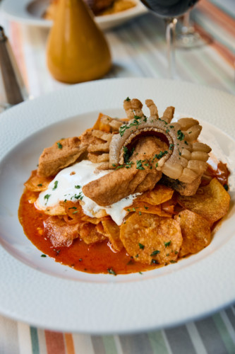 67. Filete picante de cerdo Mangalica con patatas fritas en grasa de pato (costilla) foto i j