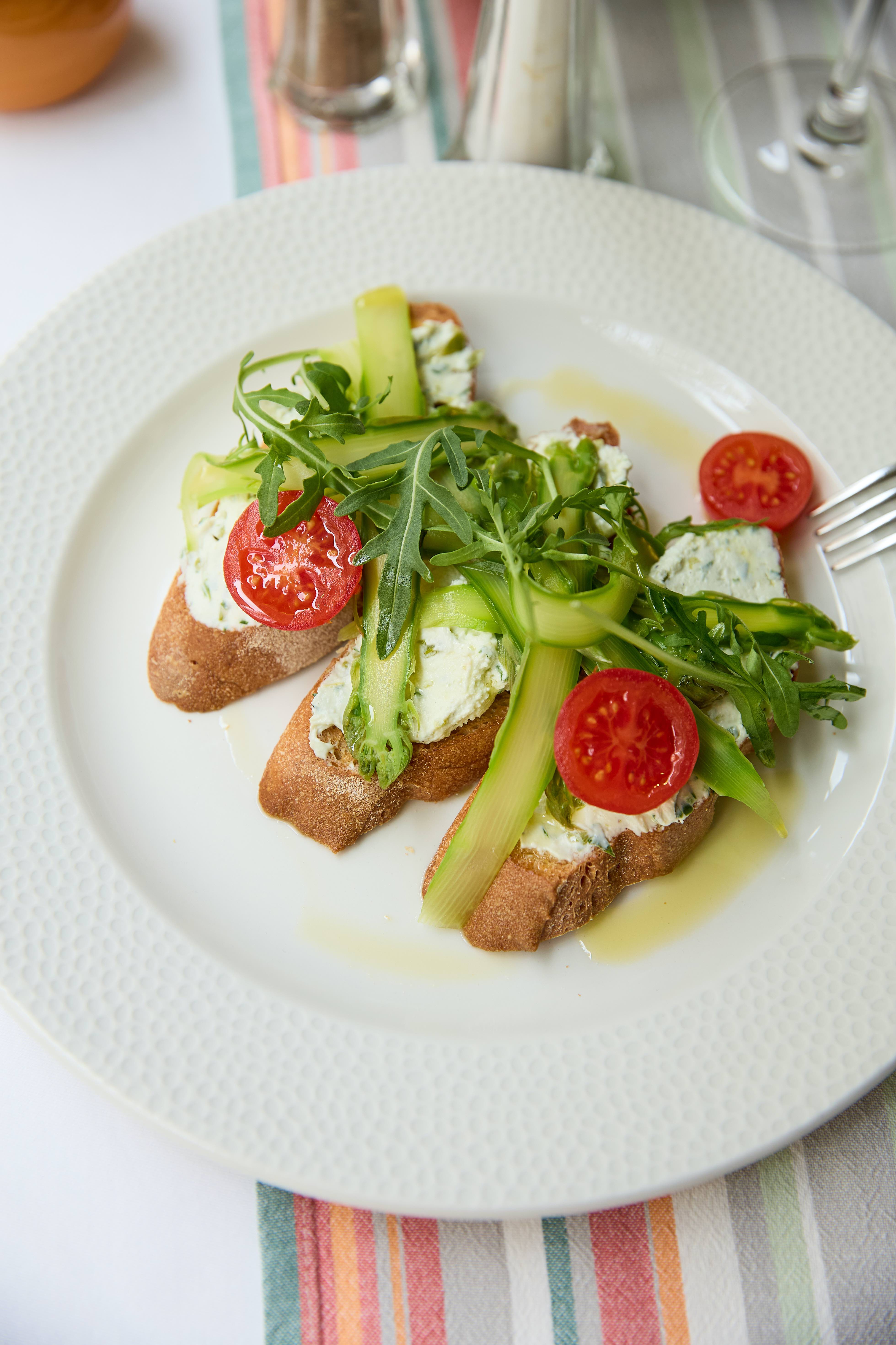 57. Bruschetta con asparagi verdi e formaggio di capra con aglio orsino Foto a g