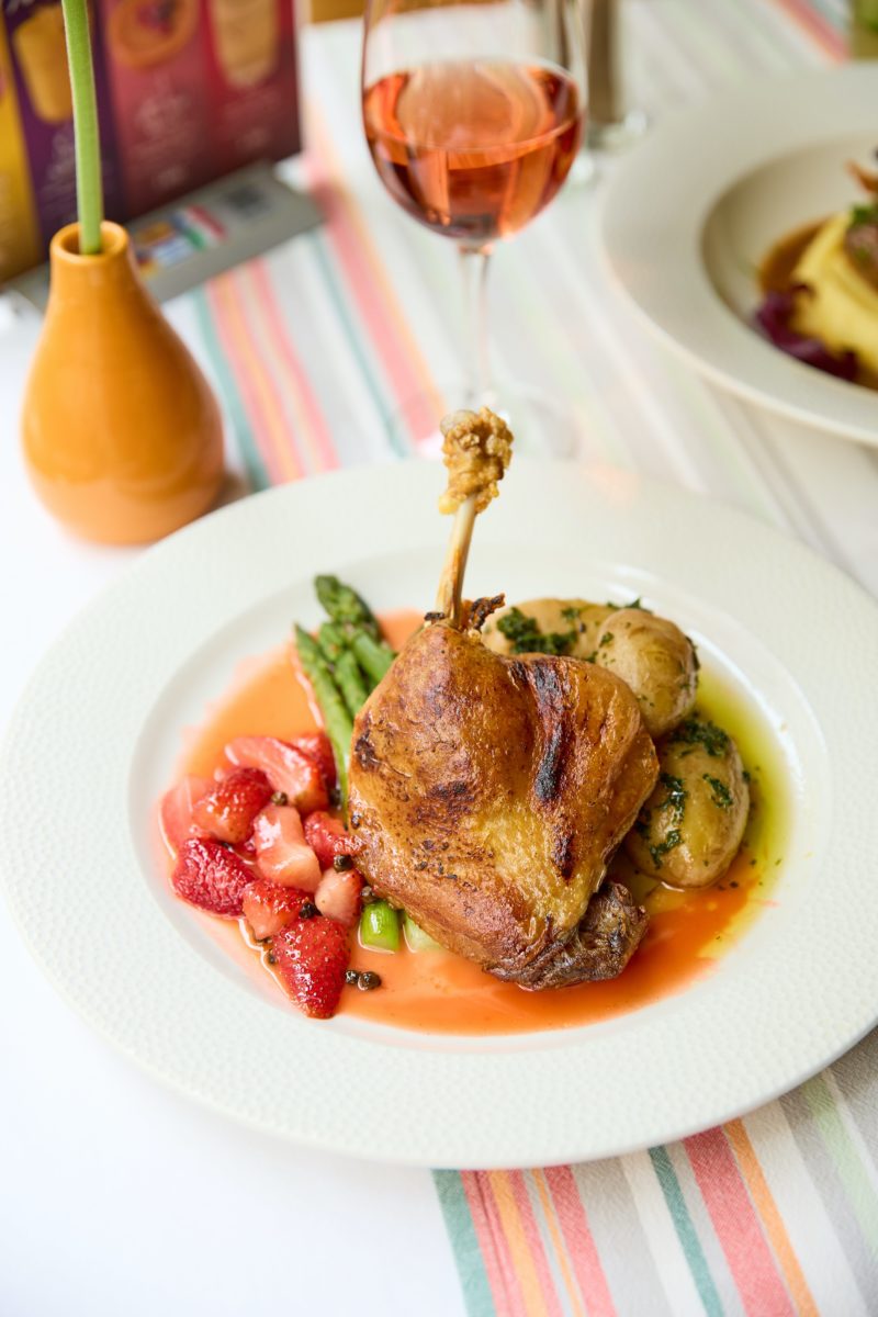 66. Coscia d’anatra croccante con patate, asparagi e fragole al pepe verde Foto g l